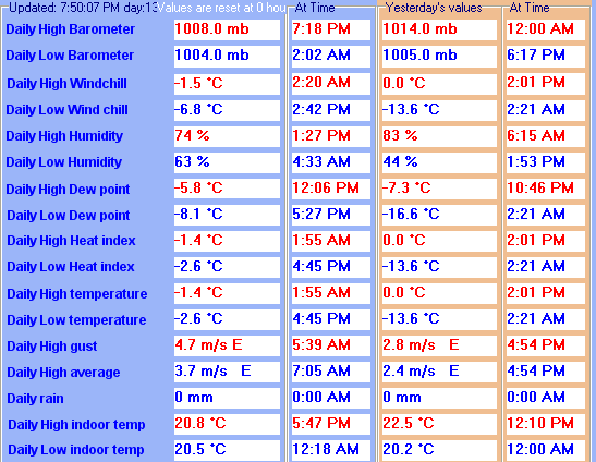 | Yesterdays rainfall | 0.0 mm | DewPoint | 11.1°C (Wet Bulb :15.2°C ) |