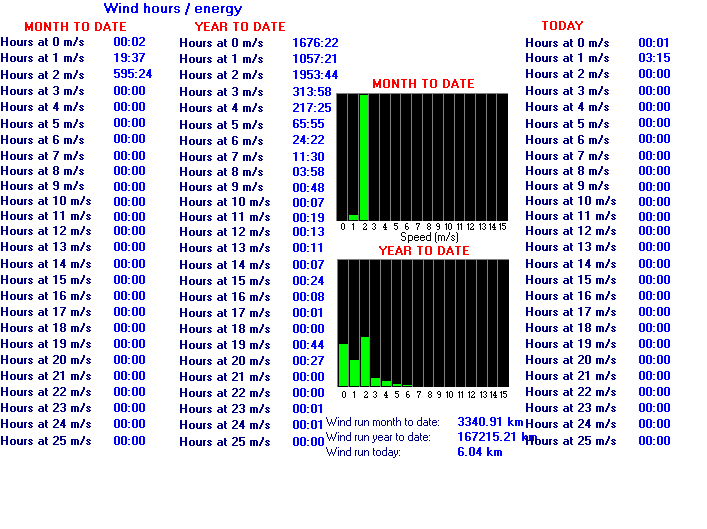 | Maximum Gust (since midnight) | 2.1 m/s at: 5:24 PM | Maximum 1 minute average (since midnight) | 1.7 m/s at: 5:24 PM |