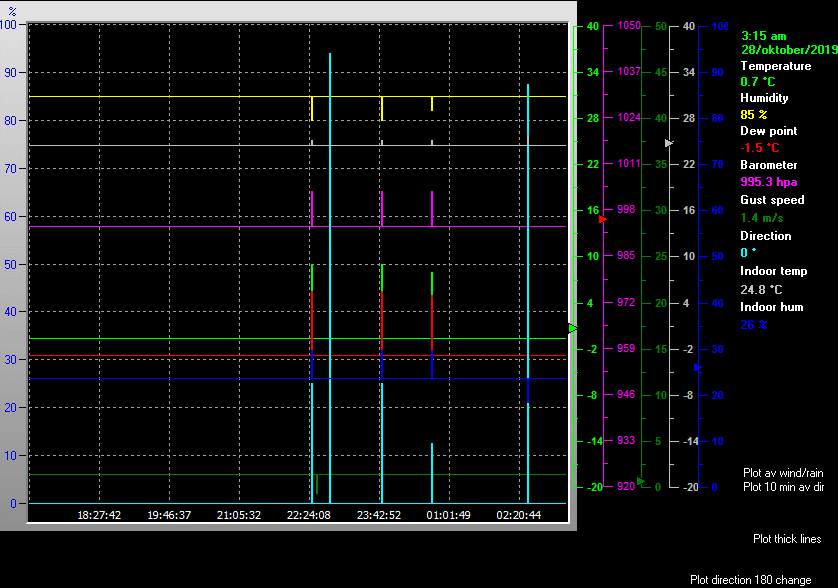| Maximum rain per minute (last hour) | 0.0 mm/min | Maximum rain per hour (last 6 hours) | 0.0 mm/hour |