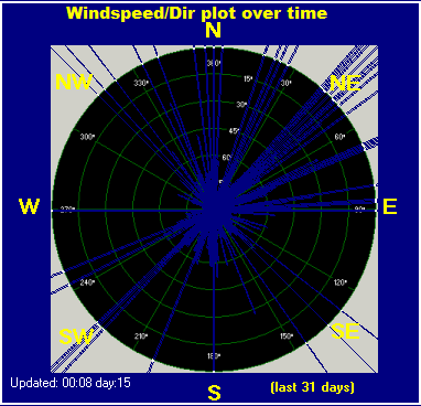 Maximum windspeed = 25.7 m/s from 045°( NE) on day 15 at time 00:02